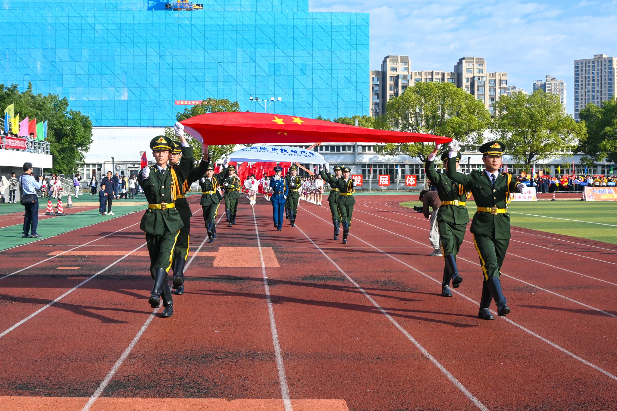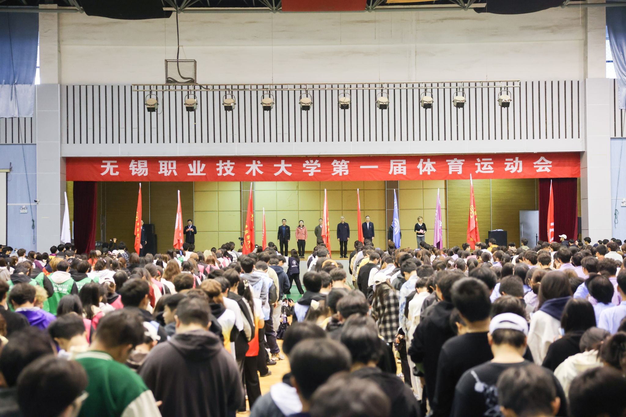 6日上午的开幕式上,全体在锡校领导及学校相关职能部门、各二级学院负责人在主席台就座,各代表队热情洋溢地参加了入场式方阵表演。副校长储开峰主持开幕式。
