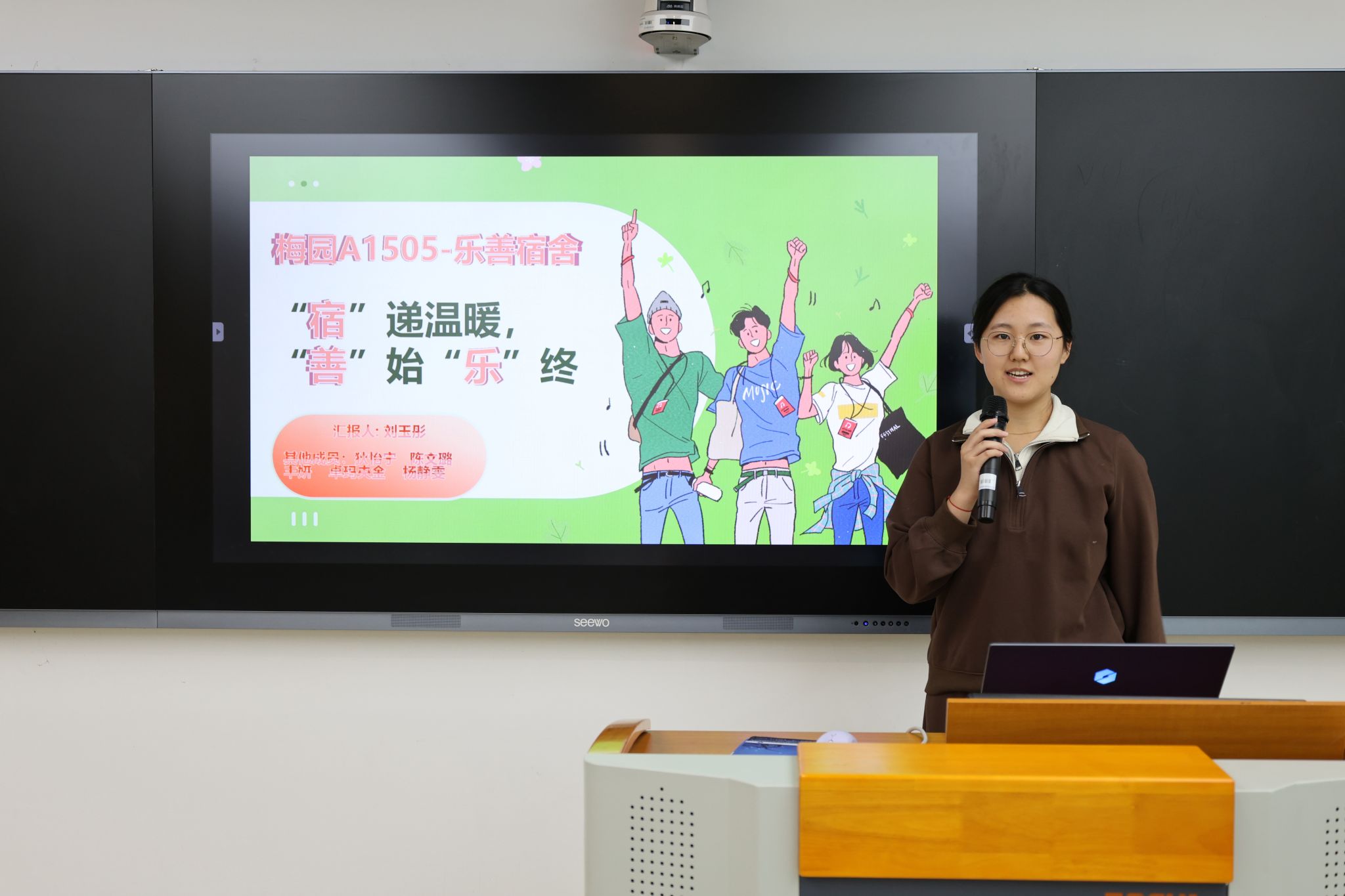 在精彩的"宿舍故事分享"环节,各获奖宿舍代表通过精心制作的PPT和短视频,生动展现了宿舍生活的点点滴滴。有的讲述了室友们深夜钻研专业知识、互帮互助的励志故事;有的分享了同窗之间在困难时刻伸出援手、共渡难关的感人经历;还有的展示了宿舍成员从陌生到熟悉、从个性张扬到团结协作的成长历程。这些真实动人的故事,充分展现了当代大学生积极向上的精神风貌和深厚真挚的同窗情谊。关工委老教师于云波勉励同学们“宿舍是你们大学时光里最温暖的港湾,愿你们在这个小小的集体里收获真挚情谊,锤炼优秀品格,让宿舍文化成为人生路上的宝贵财富,在青春赛道上奋力奔跑!”