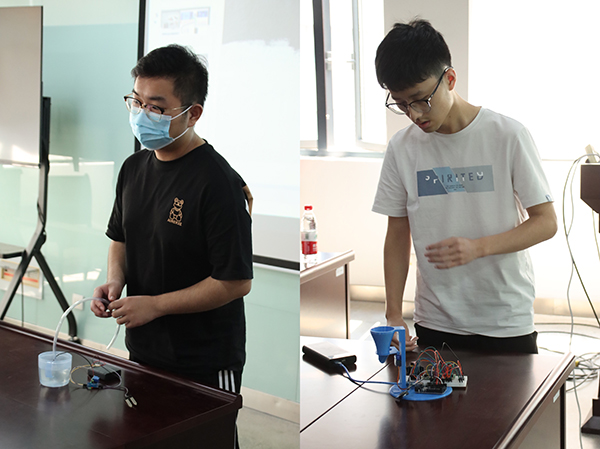 参赛选手们按照顺序轮流上台展示自己充满创意的小发明,基于视觉追踪及红外波捕捉定位的智慧灭火系统、透明小电视、触摸二合一控制灯等形式多样、功能各异的作品令人眼前一亮,赢得了台下观众热烈的掌声。最终,来自控制22132的肖宗徳同学及其组员刘家辉、陈天、李伟斩获本次大赛冠军,学院教师为获奖同学进行颁奖。