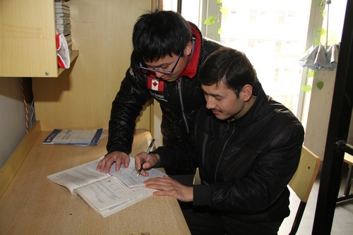 机电21131班王尧在帮助伊里亚思温习课堂上的重点和难点知识